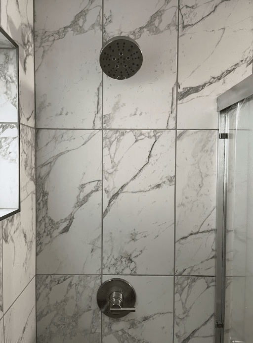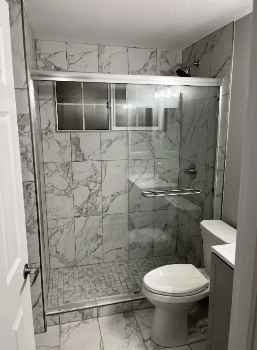 The shower is the main attraction, with its elegant marble tile that creates a clean, polished look. We chose a single-sink vanity that functions well, then installed sleek silver fixtures to bring sophistication into balance with functionality. The efficient layout of this bathroom transformation takes advantage of every inch, creating a refined and functional space that serves as a serene retreat for the homeowner.