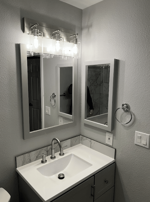 - Modern Vanity and Fixtures: The shaker-style vanity in a soft gray finish is topped with a seamless white sink and brushed nickel faucet for a clean, contemporary look. A matching mirror and updated lighting complete the setup.